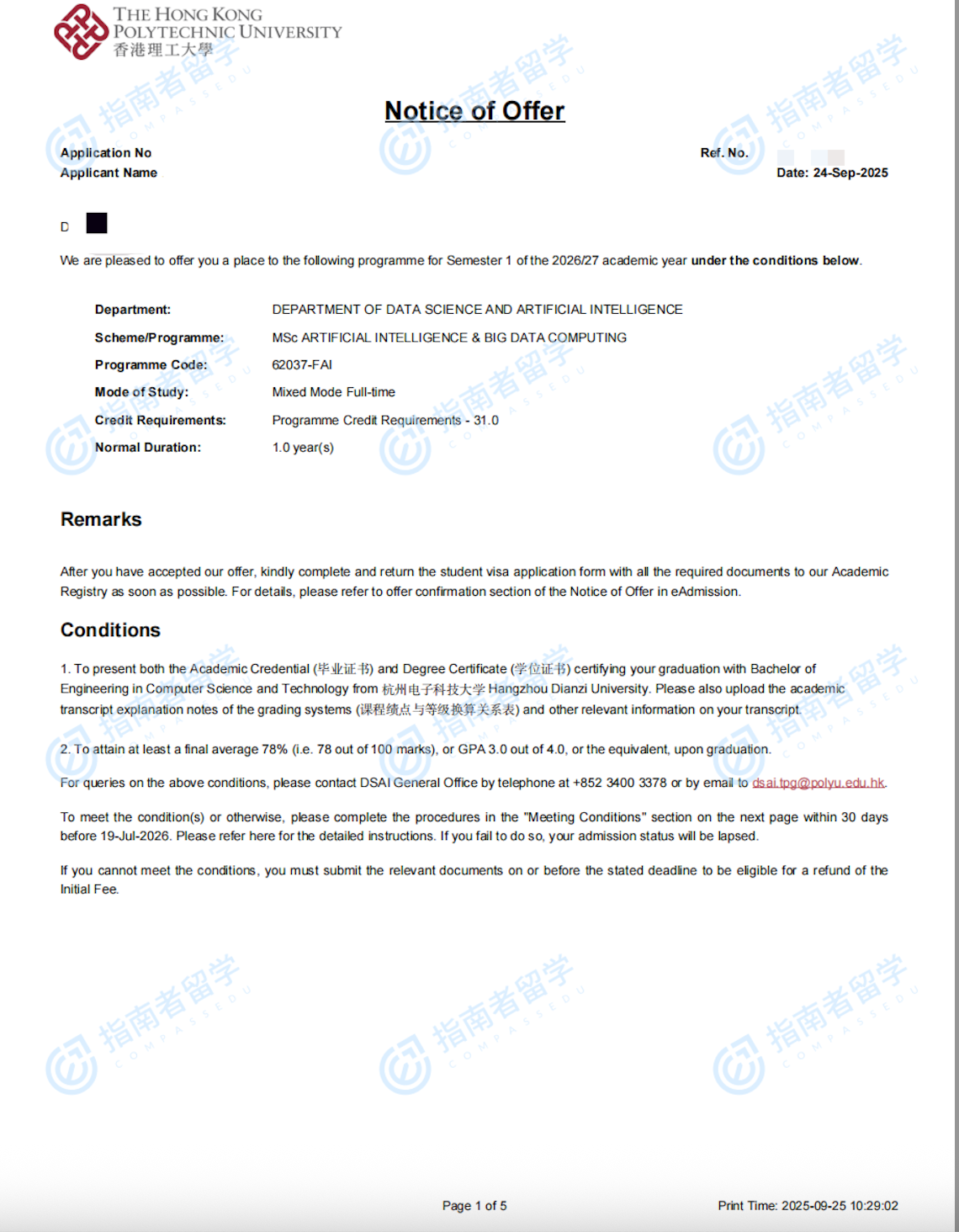香港理工大學(xué)人工智能及大數(shù)據(jù)計算理學(xué)碩士研究生offer一枚