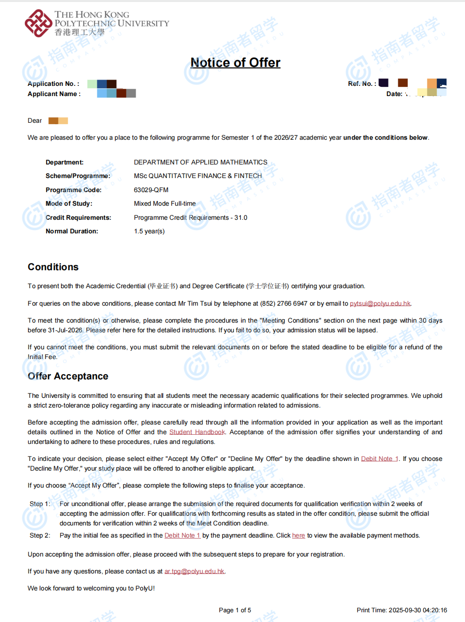 香港理工大學(xué)量化金融與金融科技理學(xué)碩士研究生offer一枚