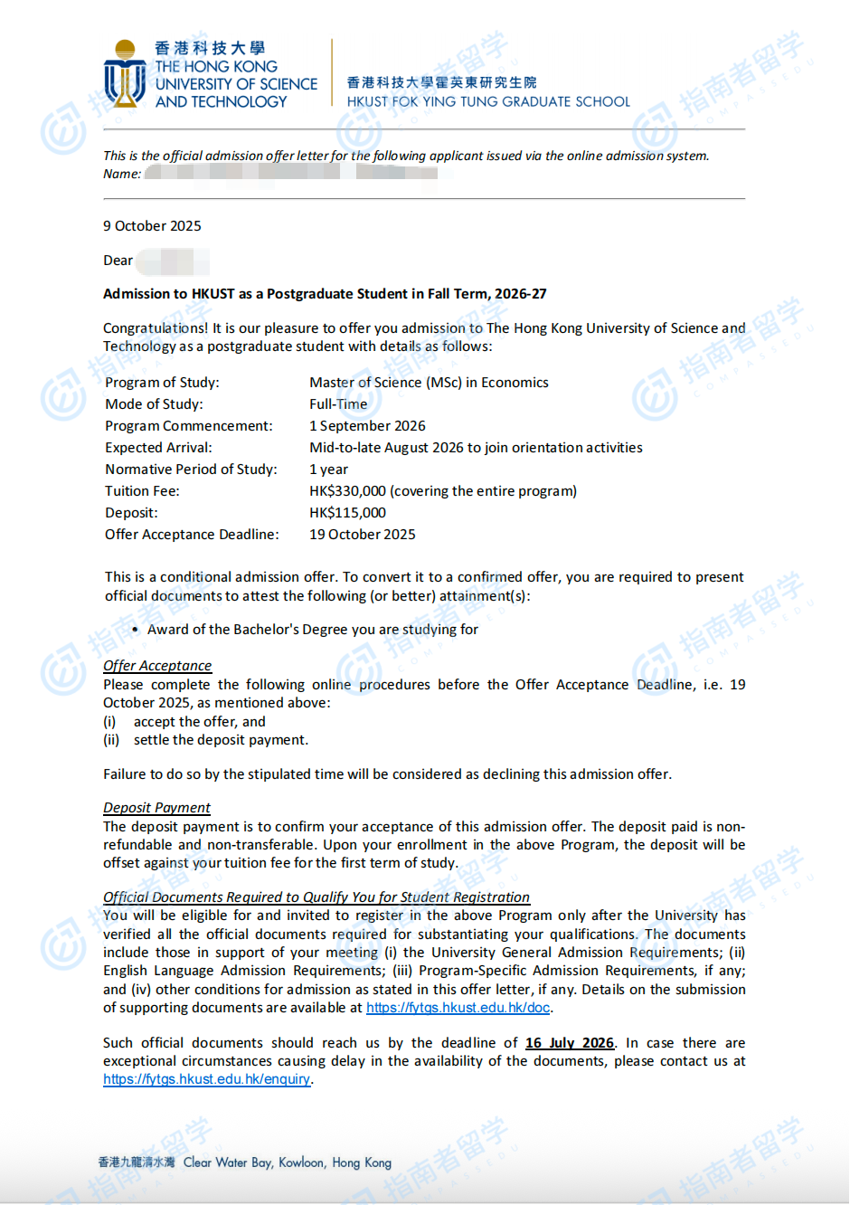 香港科技大學(xué)經(jīng)濟(jì)學(xué)理學(xué)碩士研究生offer一枚