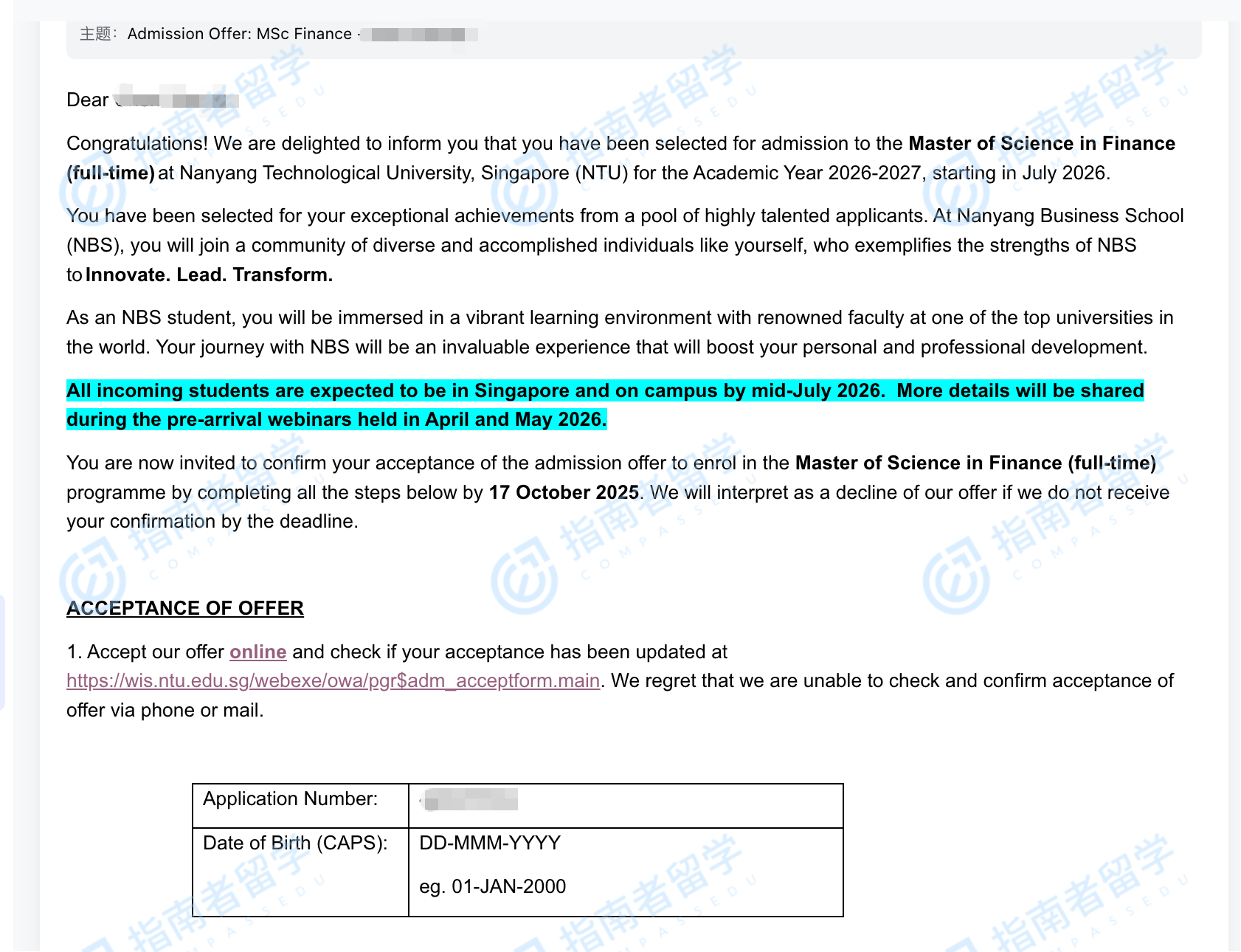 南洋理工大學(xué)金融學(xué)理學(xué)碩士研究生offer一枚