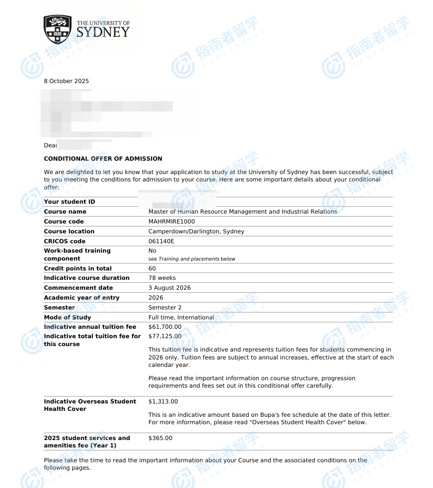 悉尼大學(xué)人力資源管理與勞資關(guān)系碩士研究生offer一枚
