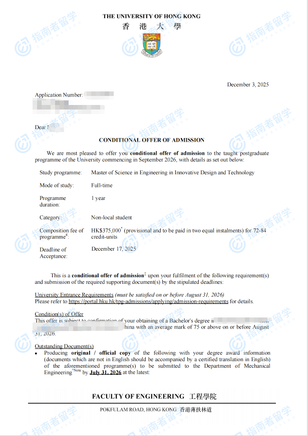 香港大學(xué)創(chuàng)新設(shè)計與科技(工程)理學(xué)碩士研究生offer一枚