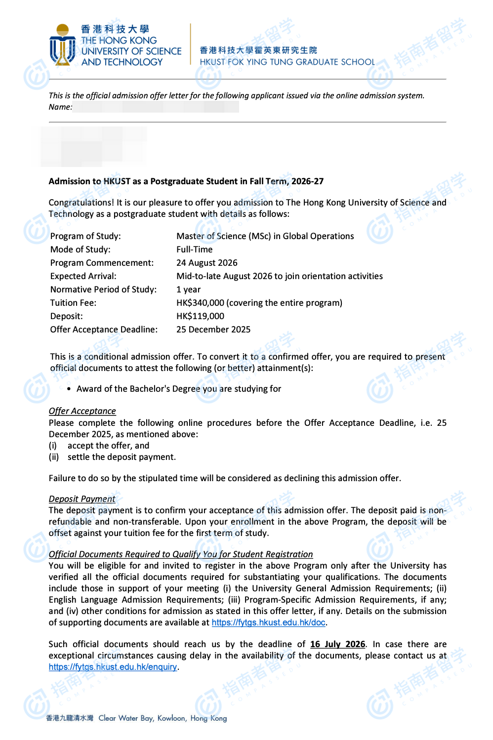 香港科技大學(xué)全球運(yùn)營(yíng)理學(xué)碩士研究生offer一枚