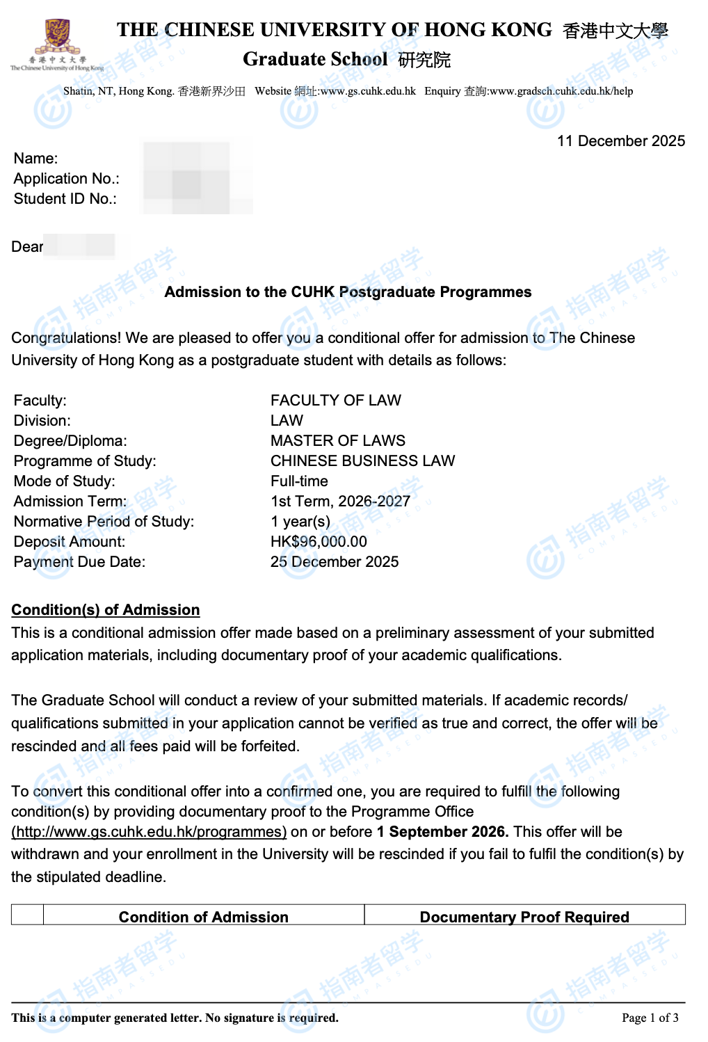 香港中文大學(xué)中國商法法學(xué)碩士研究生offer一枚