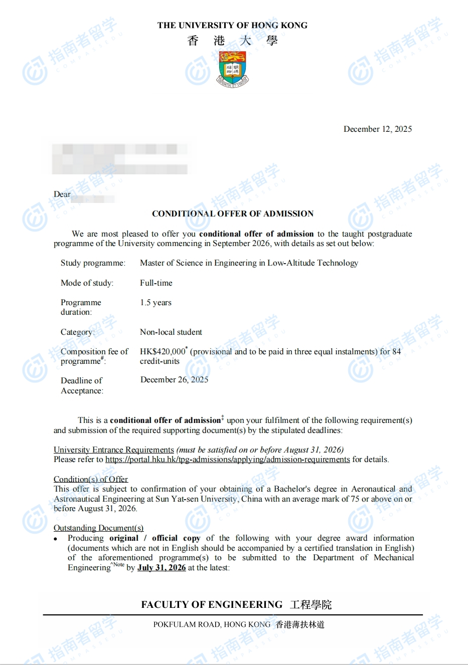 香港大學(xué)低空科技(工程)理學(xué)碩士研究生offer一枚