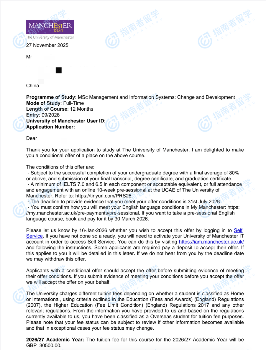 曼徹斯特大學管理與信息系統(tǒng):變化與發(fā)展理學碩士研究生offer一枚