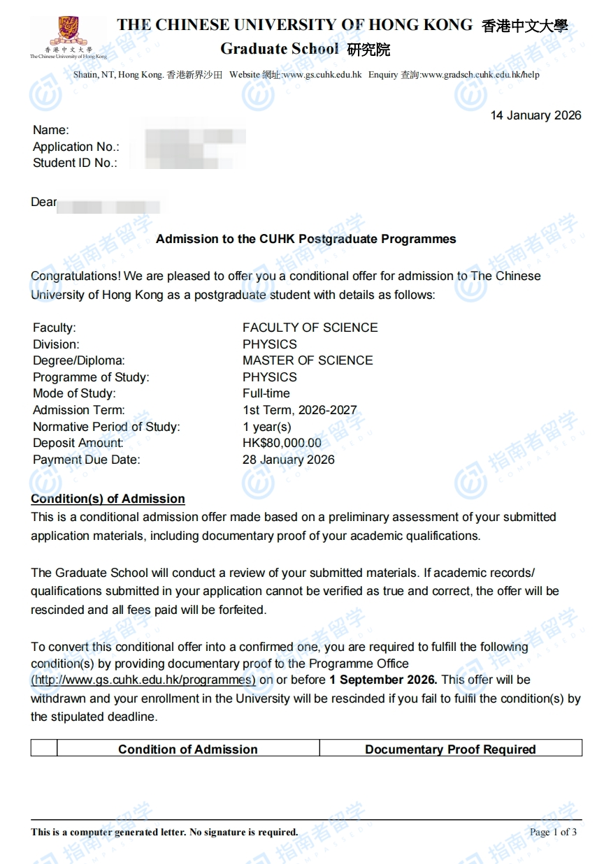 香港中文大學(xué)物理學(xué)理學(xué)碩士研究生offer一枚