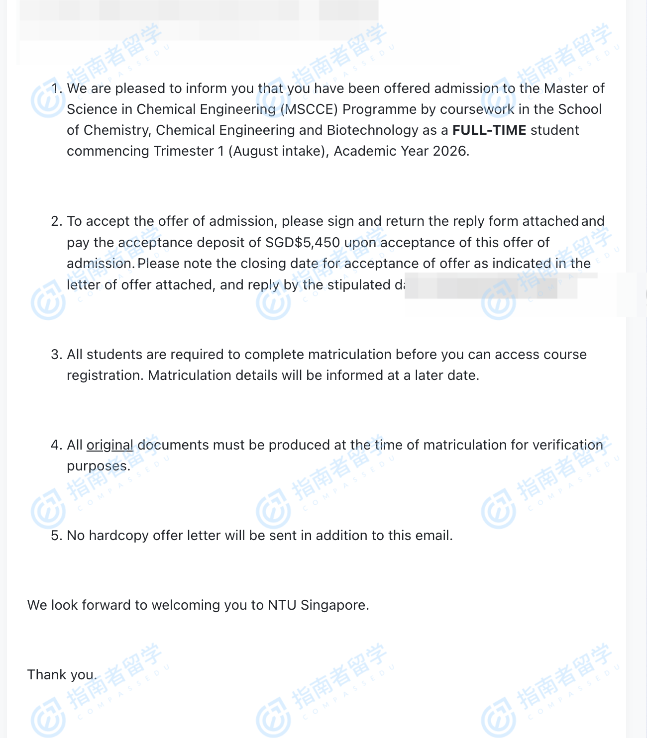 南洋理工大學化學工程理學碩士研究生offer一枚