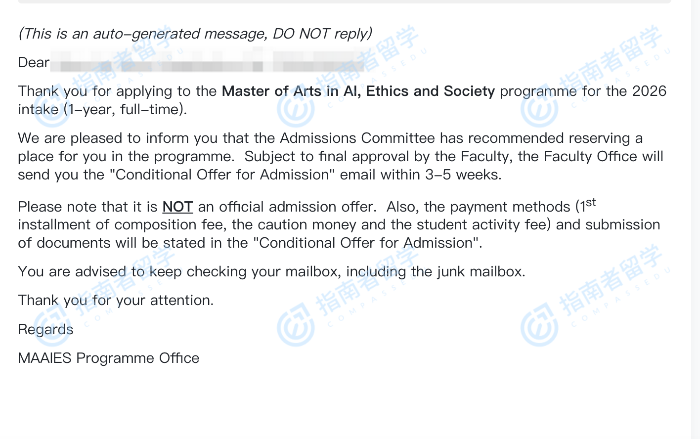 香港大學(xué)人工智能、倫理與社會文學(xué)碩士研究生offer一枚