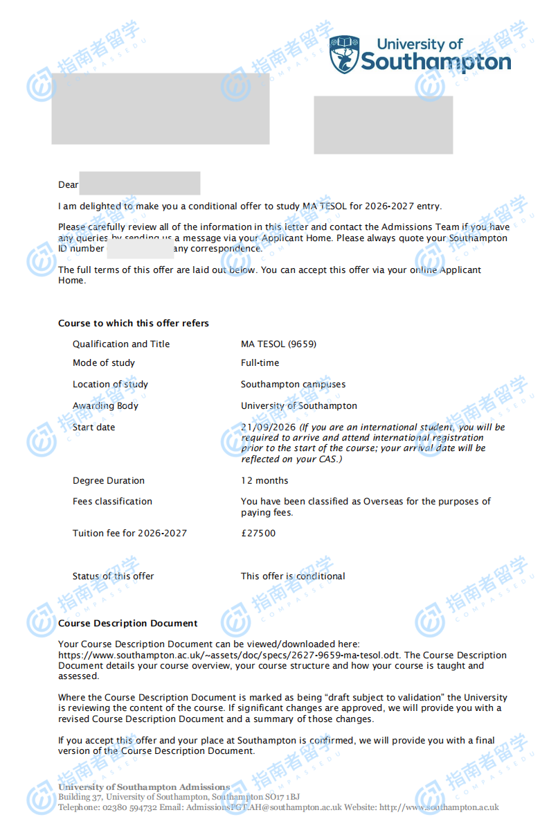 南安普頓大學(xué)對外英語教學(xué)文學(xué)碩士研究生offer一枚