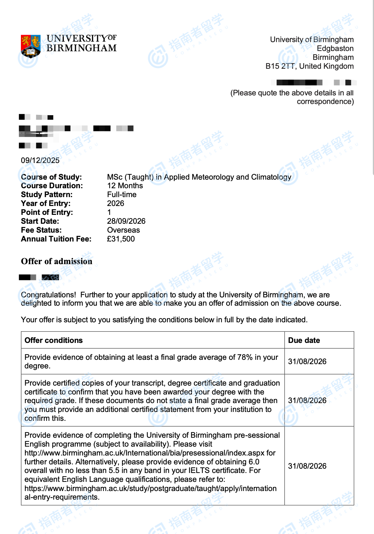 伯明翰大學(xué)應(yīng)用氣象學(xué)與氣候?qū)W理學(xué)碩士研究生offer一枚