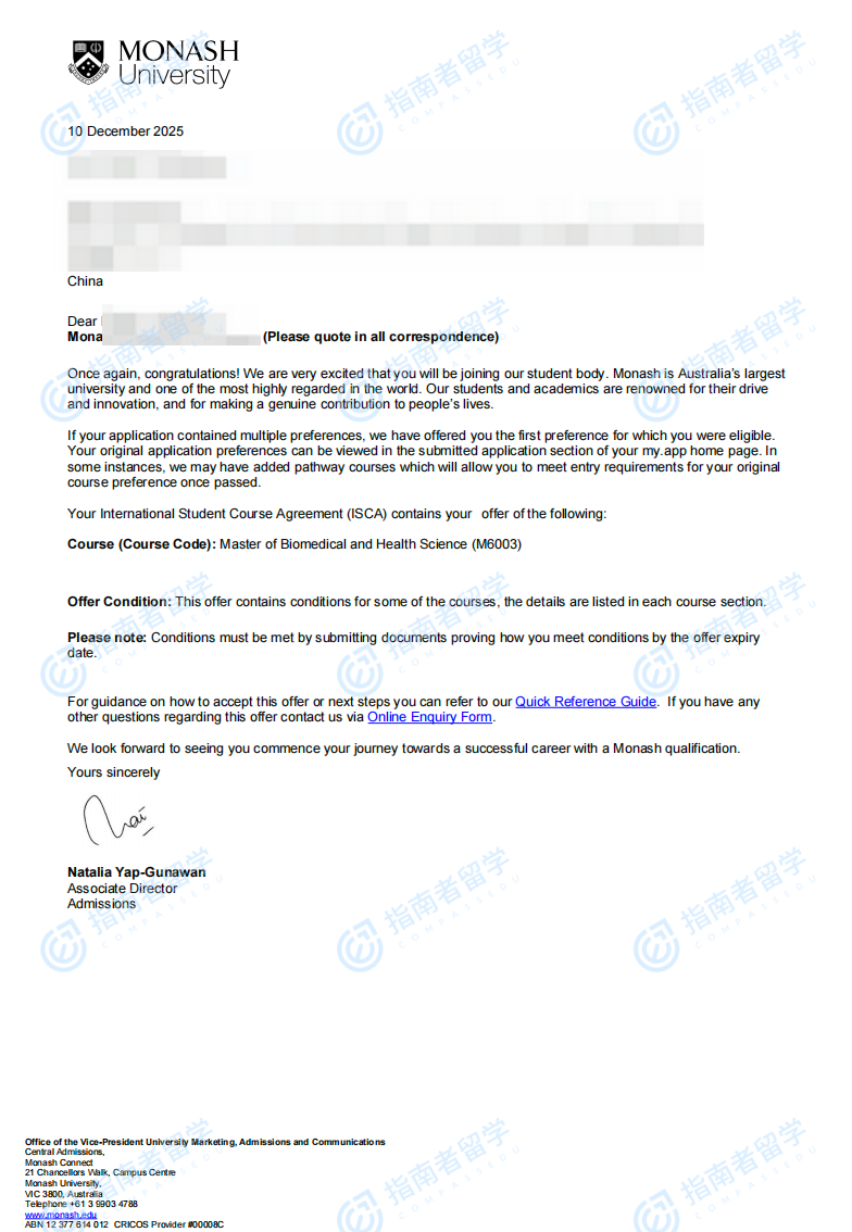 莫納什大學(xué)生物醫(yī)學(xué)與健康科學(xué)碩士研究生offer一枚