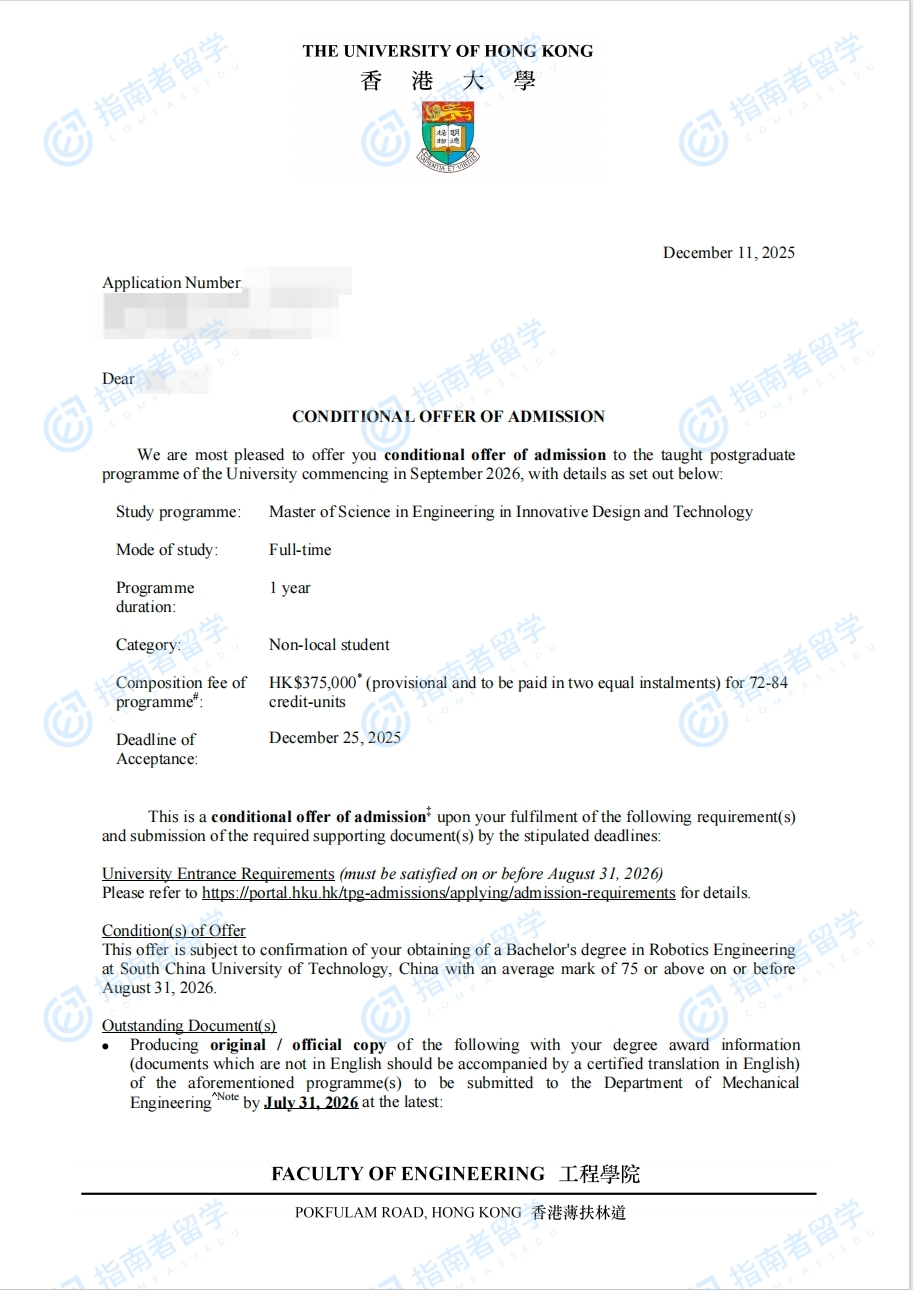 香港大學電氣與電子工程(工程)理學碩士 - 常規(guī)方向研究生offer一枚