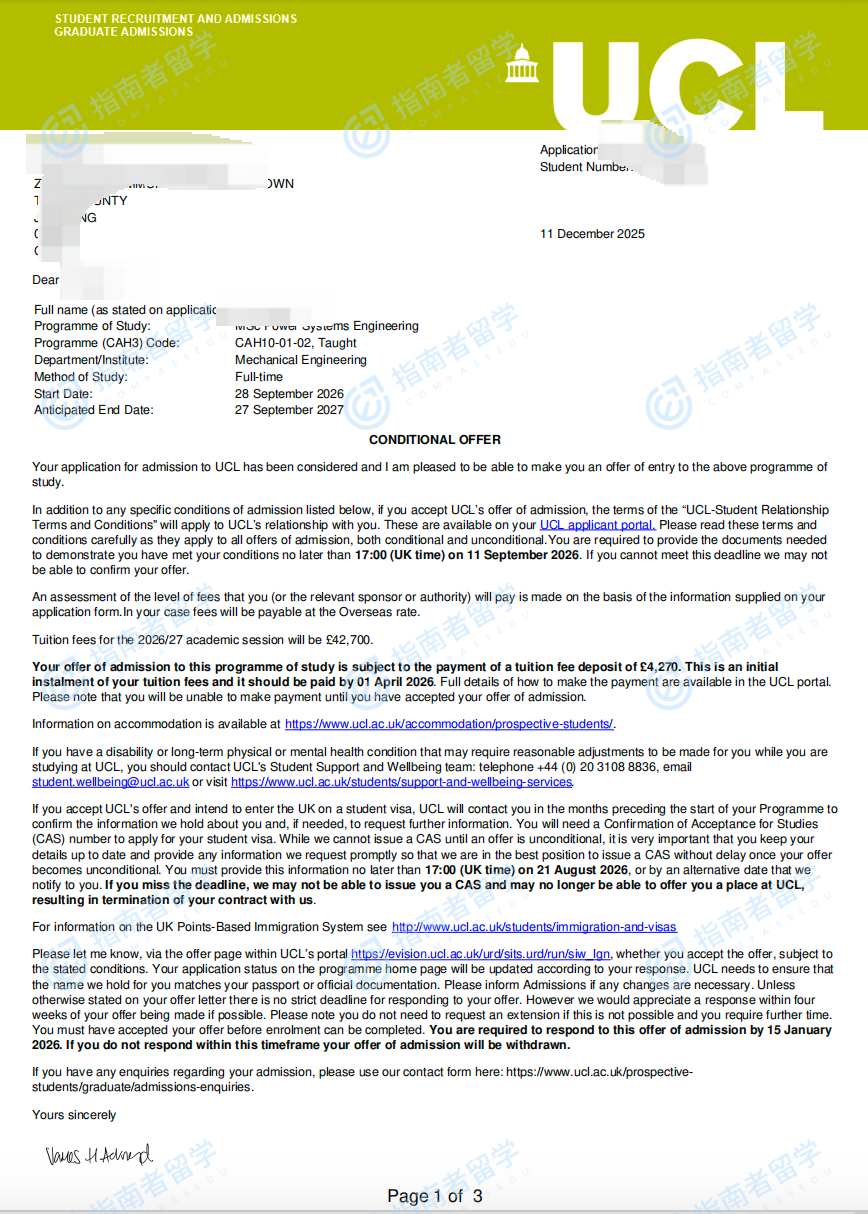 倫敦大學(xué)學(xué)院電力系統(tǒng)工程理學(xué)碩士研究生offer一枚
