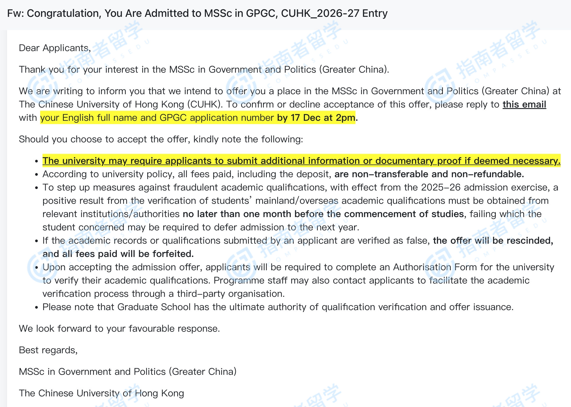香港中文大學大中華地區(qū)的政府與政治社會科學碩士研究生offer一枚