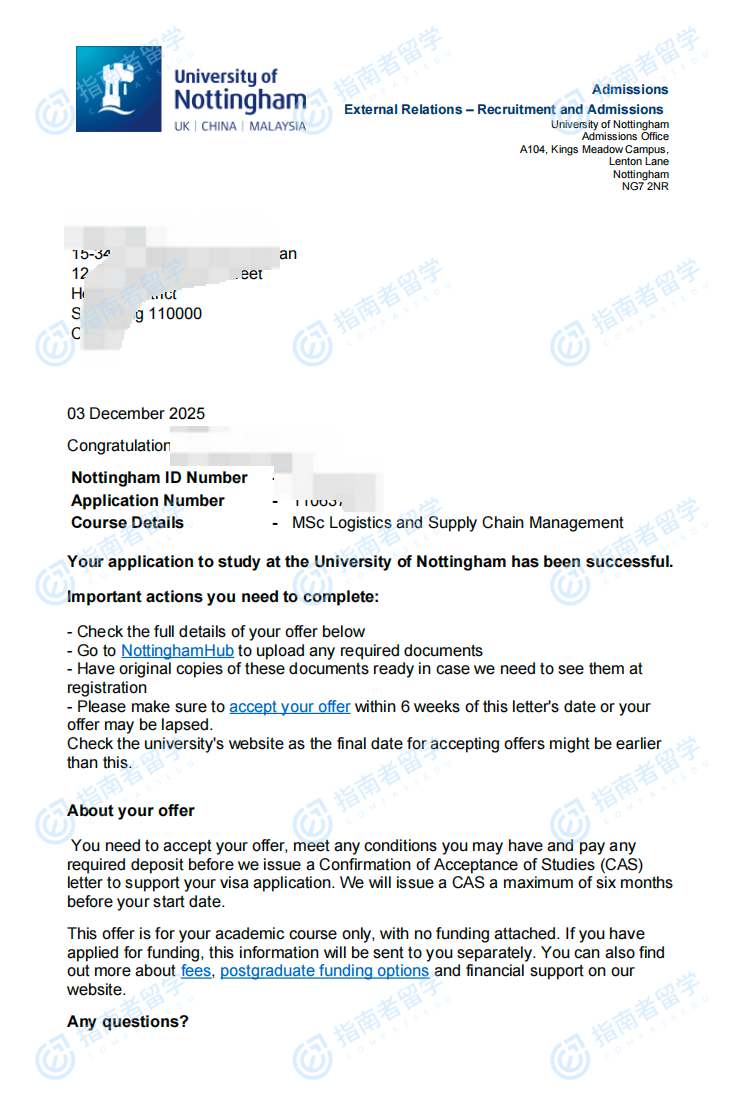 諾丁漢大學(xué)物流與供應(yīng)鏈管理理學(xué)碩士研究生offer一枚