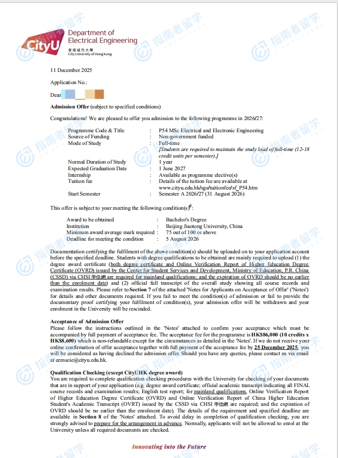 香港城市大學(xué)電機(jī)與電子工程學(xué)理學(xué)碩士研究生offer一枚