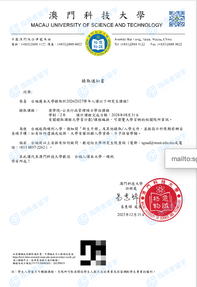 澳門(mén)科技大學(xué)公共行政管理碩士研究生offer一枚