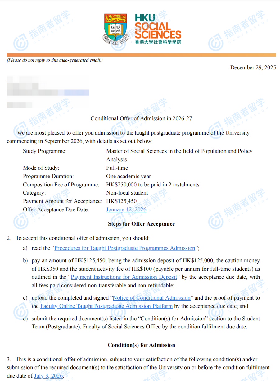 香港大學(xué)人口與政策分析社會(huì)科學(xué)碩士研究生offer一枚