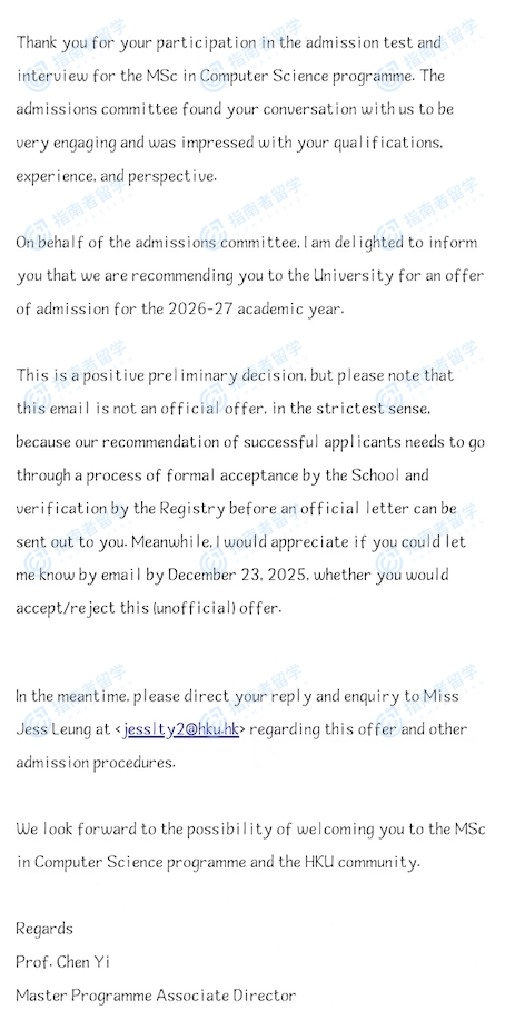 香港大學計算機科學理學碩士(常規(guī)方向)研究生offer一枚