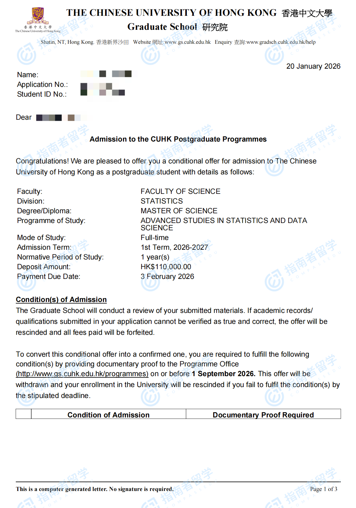 香港中文大學(xué)統(tǒng)計(jì)與數(shù)據(jù)科學(xué)高級(jí)研究理學(xué)碩士研究生offer一枚