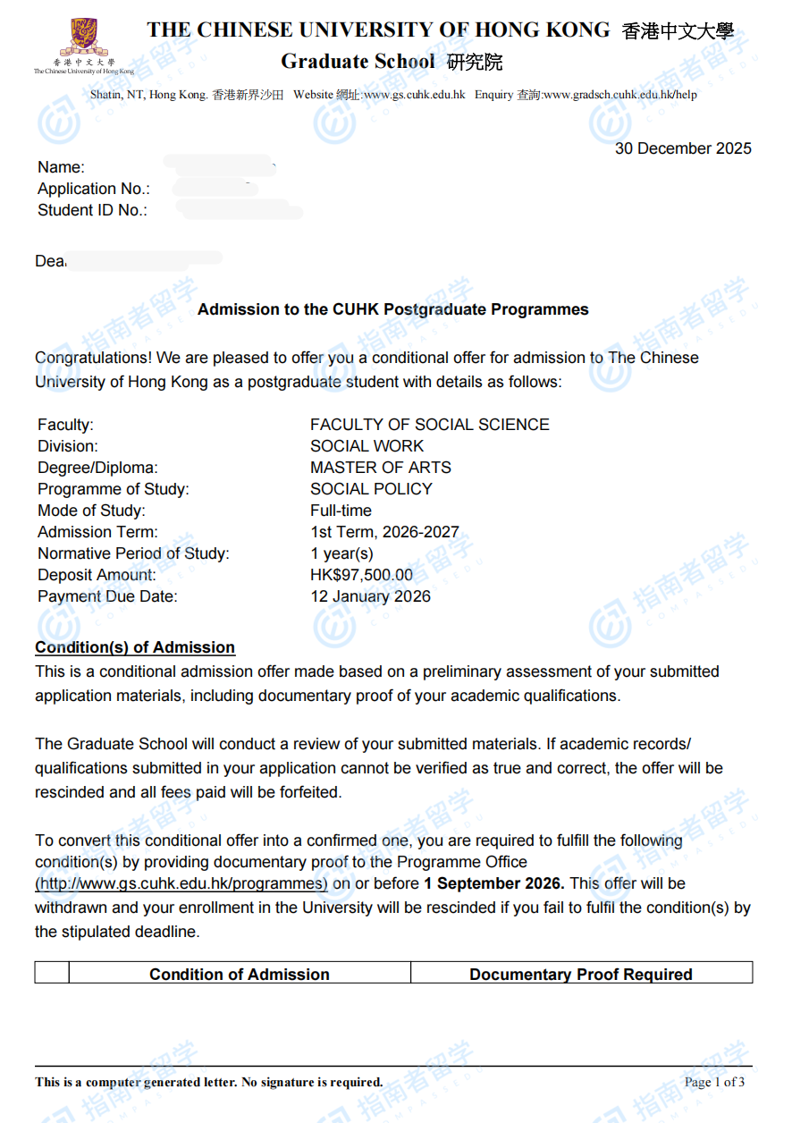 香港中文大學(xué)社會(huì)政策文學(xué)碩士研究生offer一枚