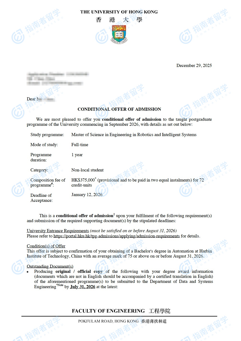 香港大學(xué)機(jī)器人與智能系統(tǒng)(工程)理學(xué)碩士研究生offer一枚