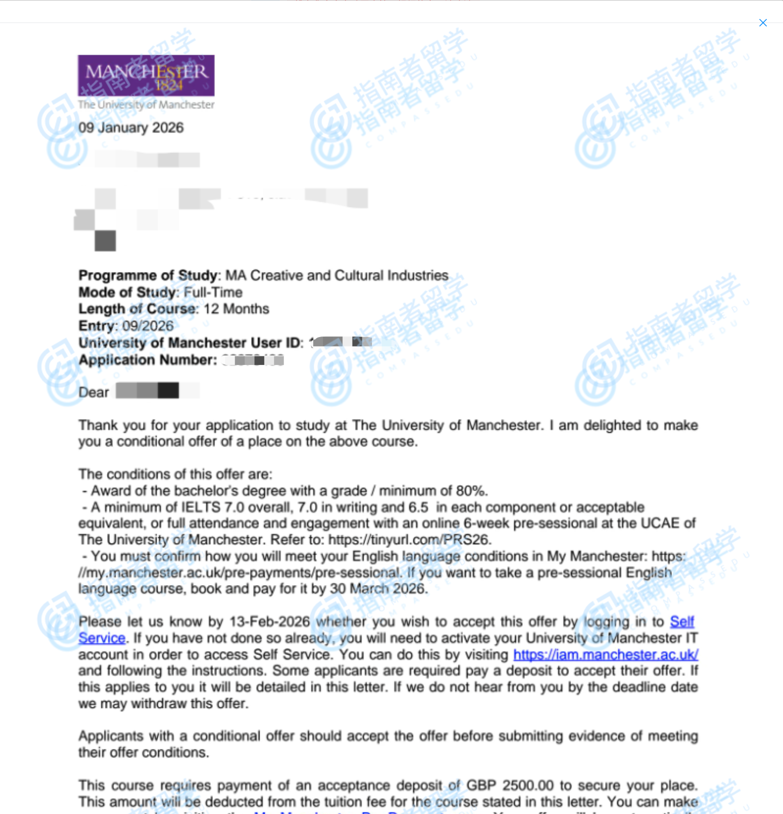 曼徹斯特大學(xué)創(chuàng)意與文化產(chǎn)業(yè)文學(xué)碩士研究生offer一枚