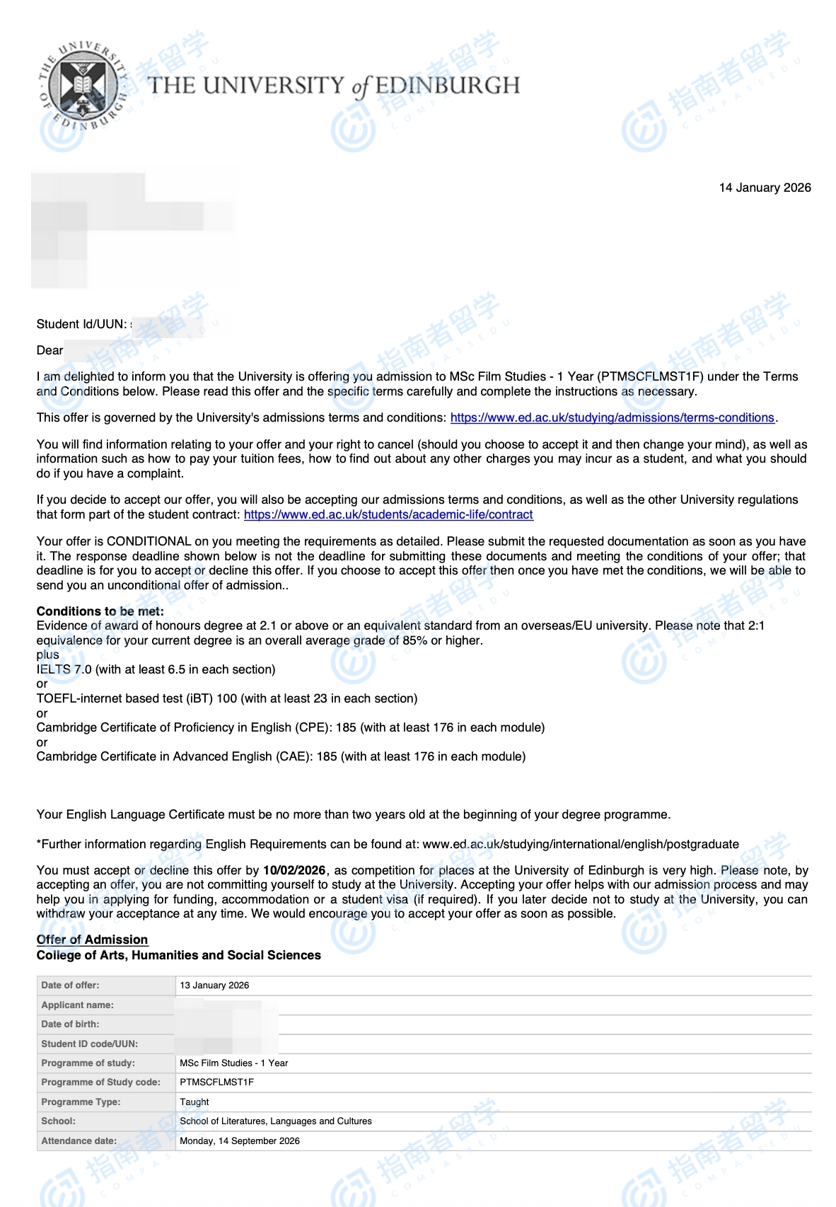 愛丁堡大學(xué)電影研究理學(xué)碩士研究生offer一枚
