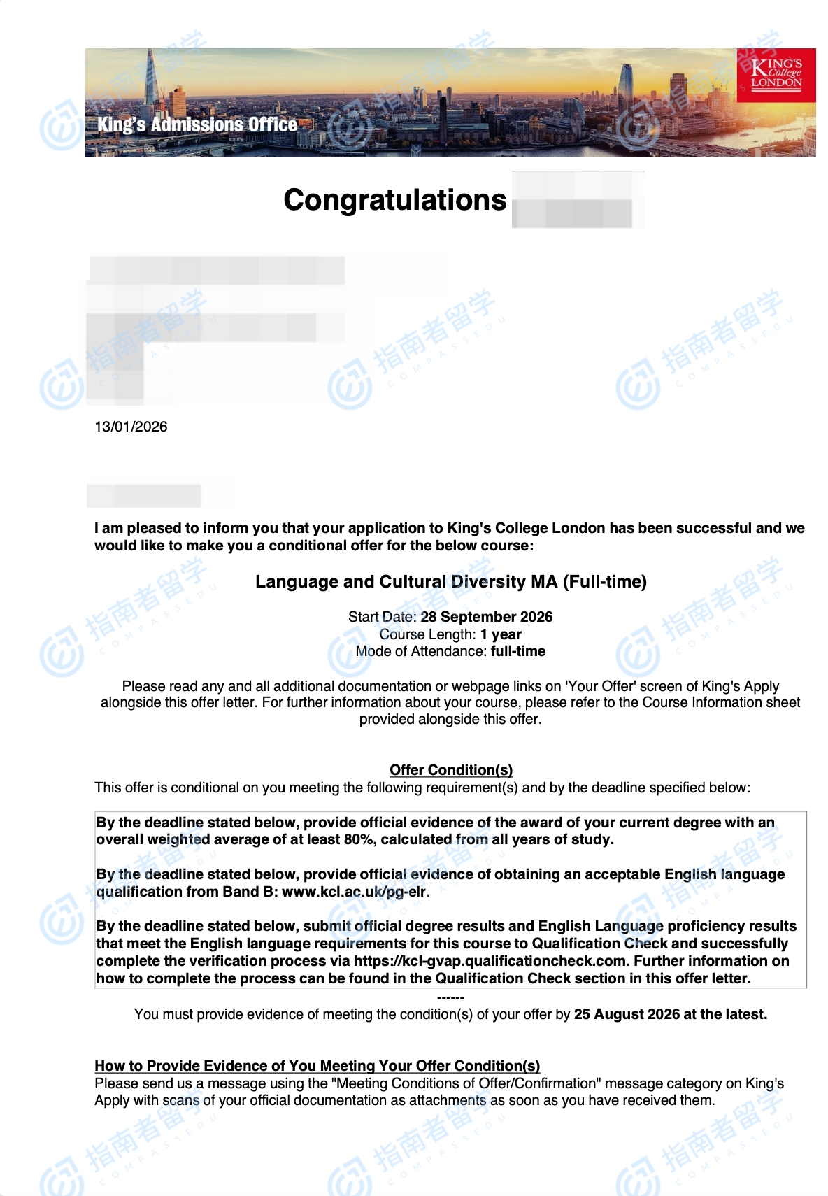倫敦大學(xué)國(guó)王學(xué)院語(yǔ)言與文化多樣性文學(xué)碩士研究生offer一枚