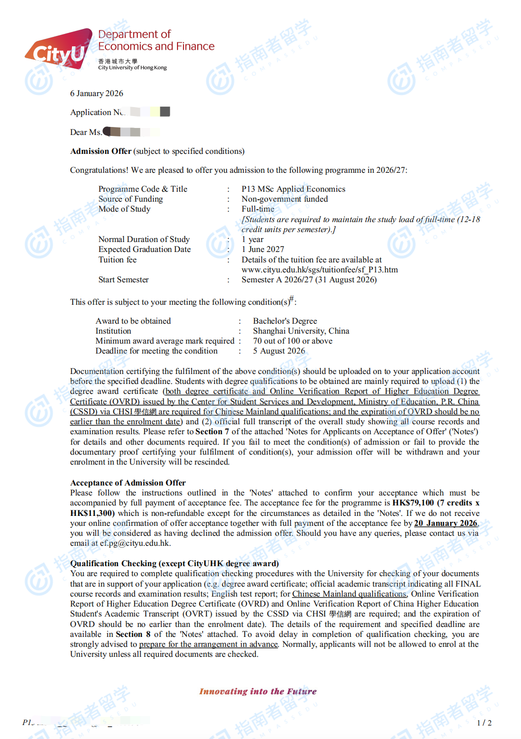 香港城市大學(xué)應(yīng)用經(jīng)濟(jì)學(xué)理學(xué)碩士研究生offer一枚
