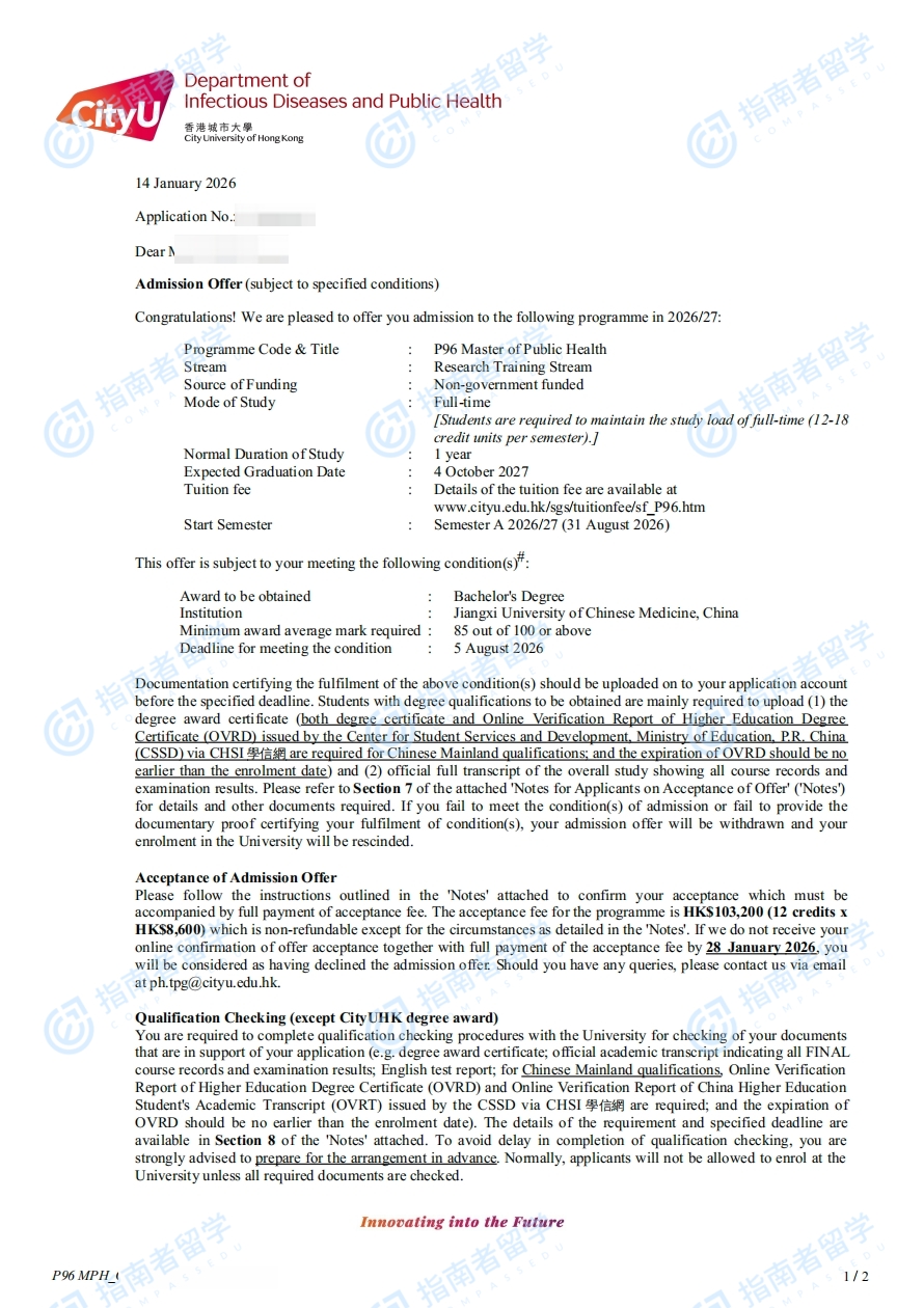 香港城市大學(xué)公共衛(wèi)生碩士研究生offer一枚