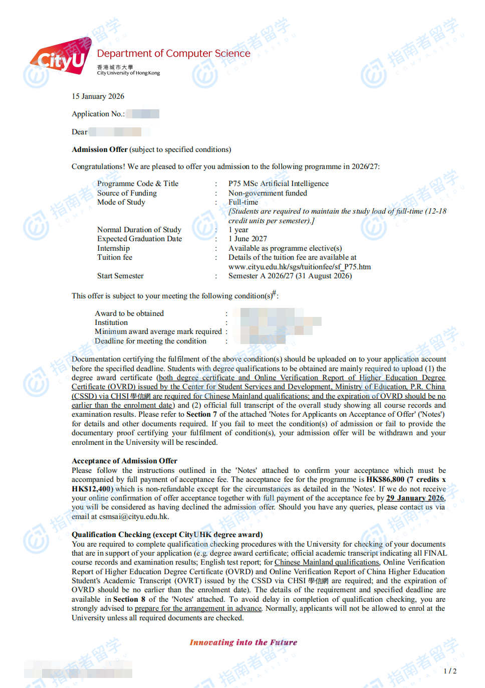 香港城市大學(xué)人工智能理學(xué)碩士研究生offer一枚