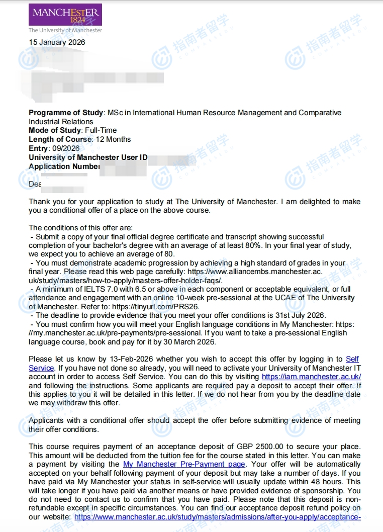曼徹斯特大學國際人力資源管理與比較勞資關系理學碩士研究生offer一枚