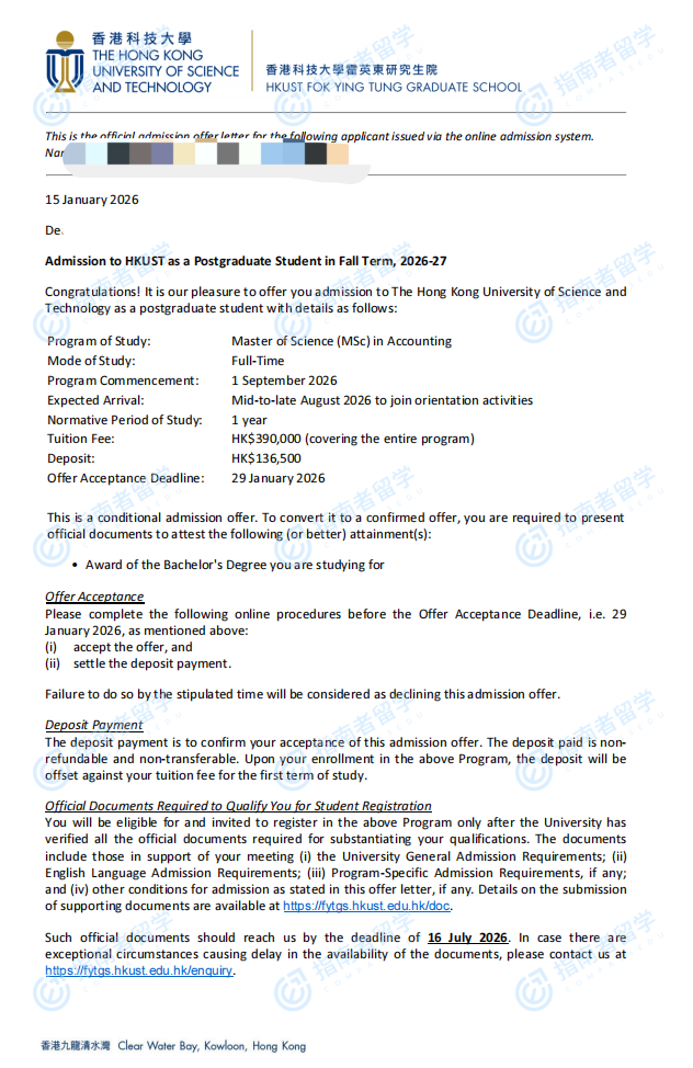 香港科技大學會計學理學碩士研究生offer一枚