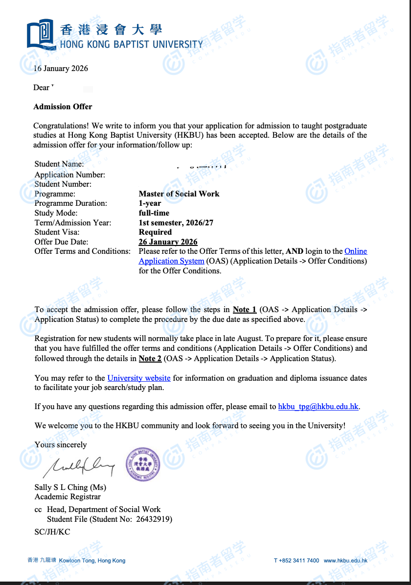 香港浸會大學(xué)社會工作碩士研究生offer一枚