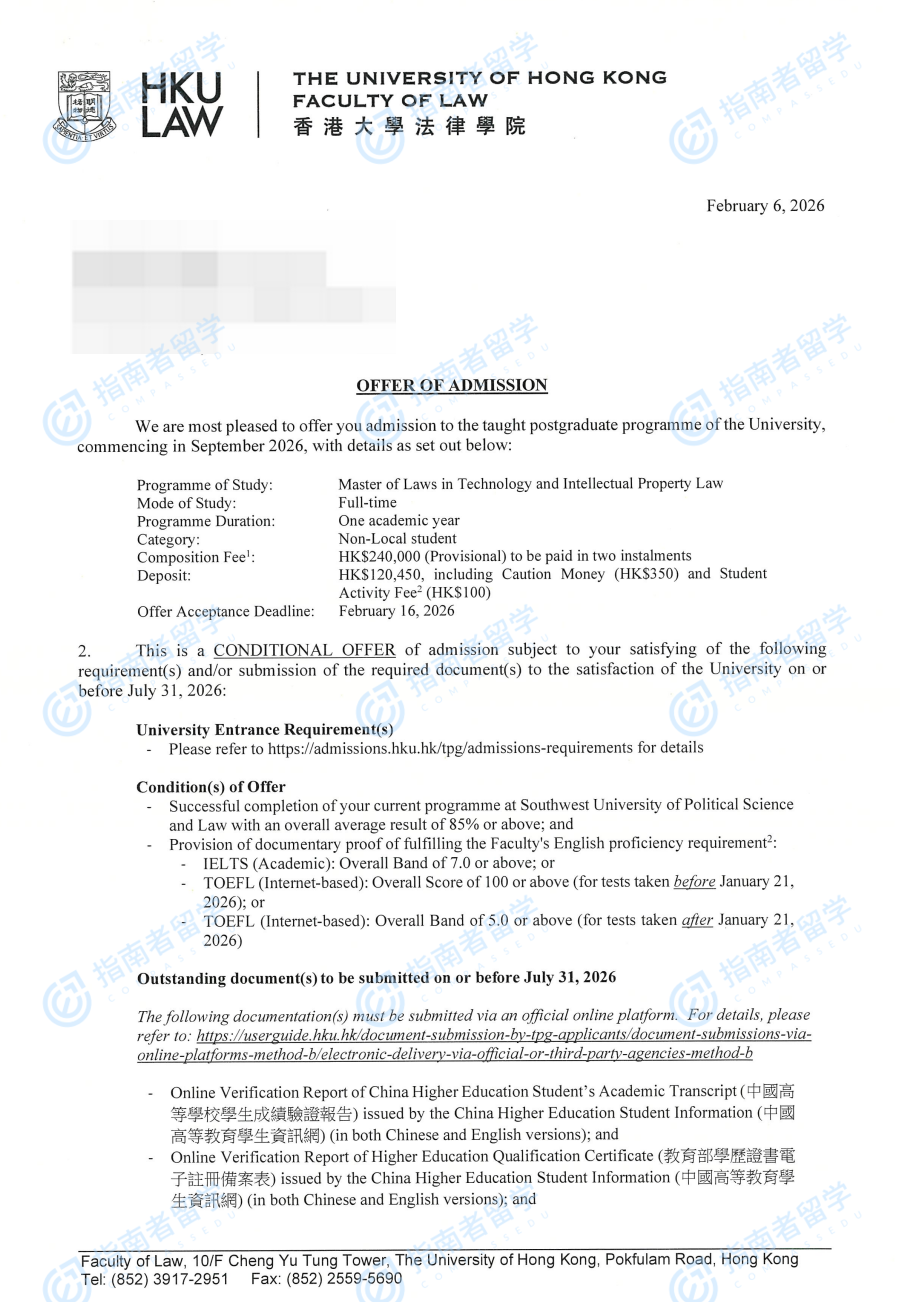 香港大學(xué)技術(shù)與知識(shí)產(chǎn)權(quán)法法學(xué)碩士研究生offer一枚