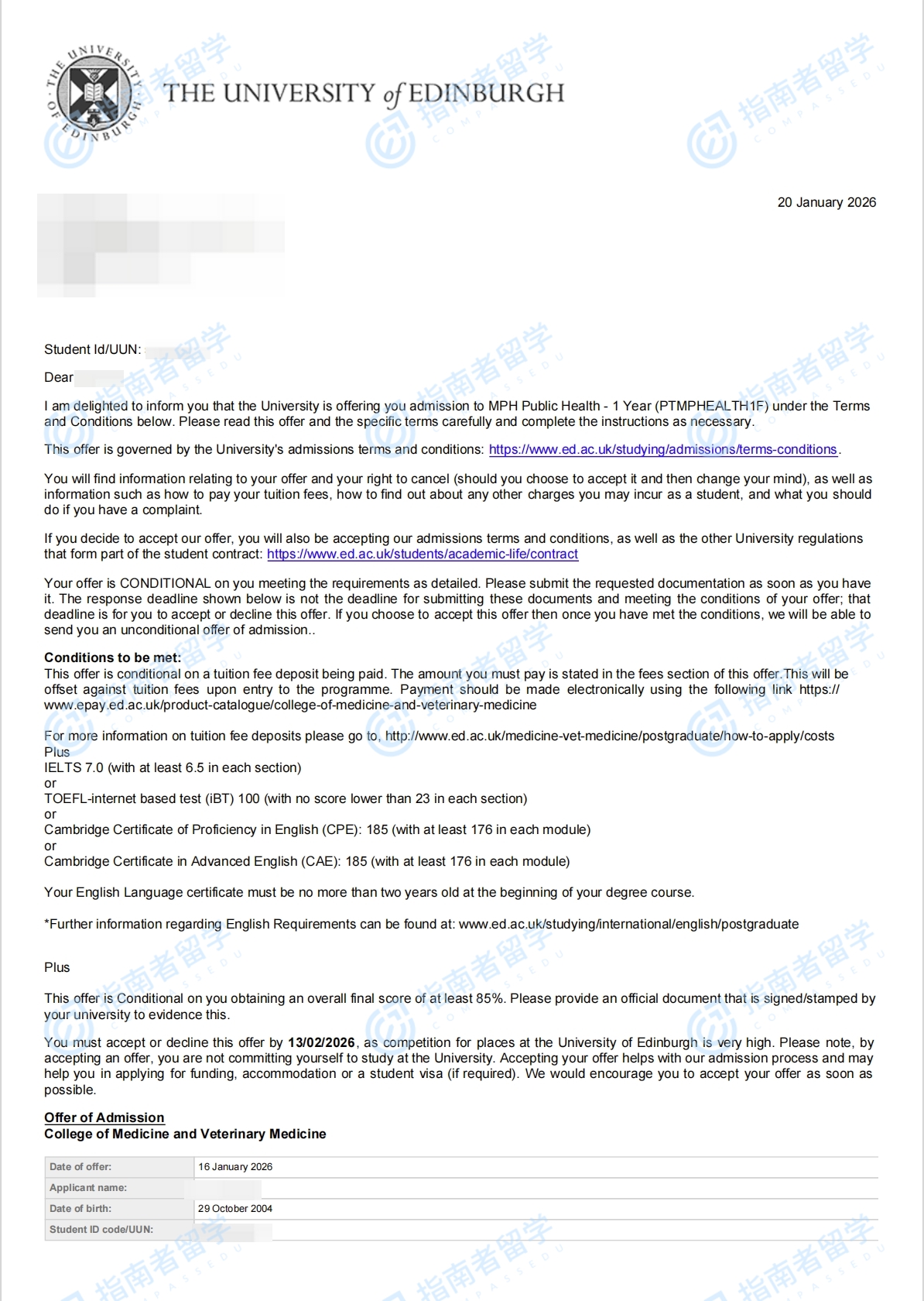 愛丁堡大學(xué)公共衛(wèi)生碩士研究生offer一枚