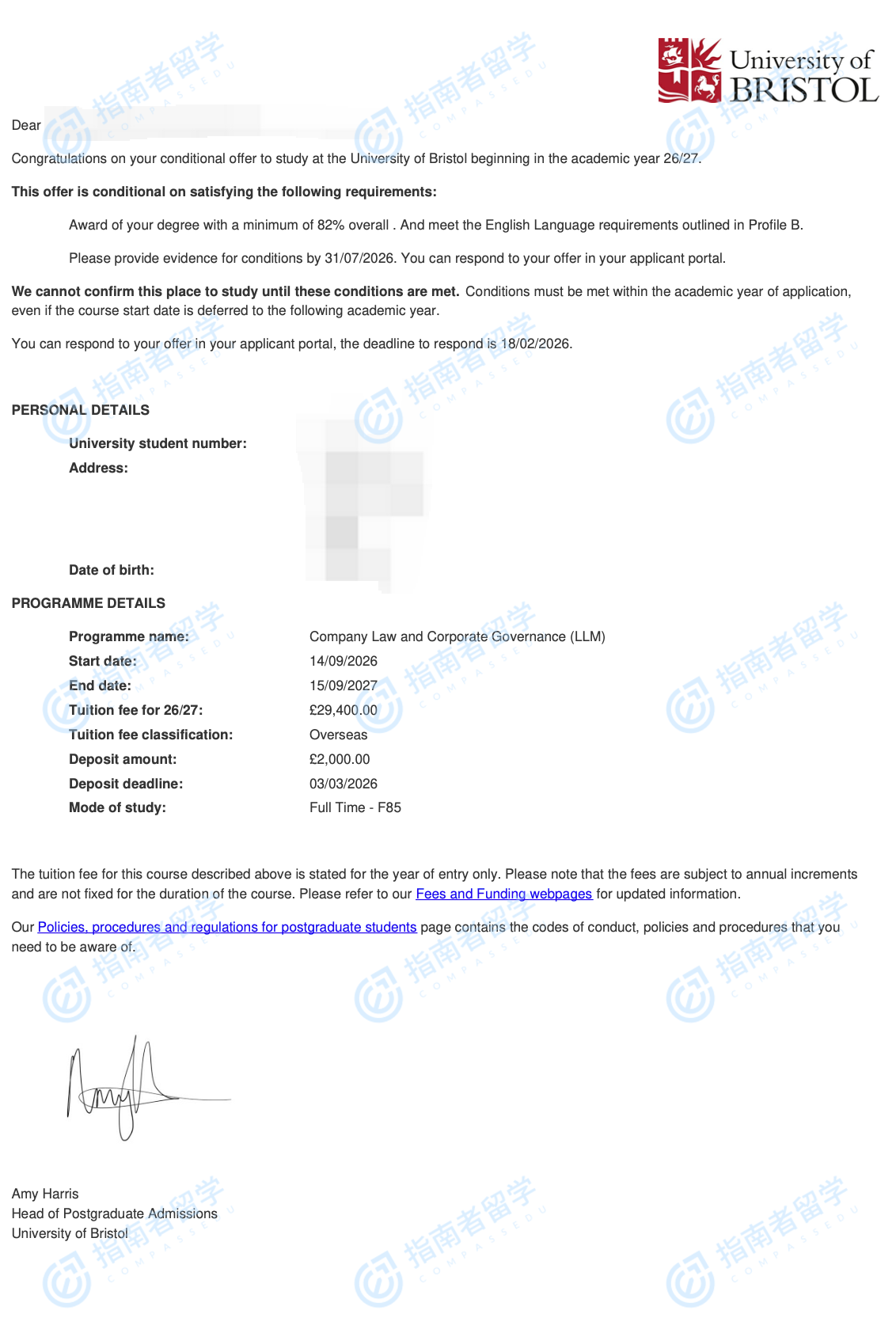 布里斯托大學(xué)公司法與企業(yè)管治法學(xué)碩士研究生offer一枚