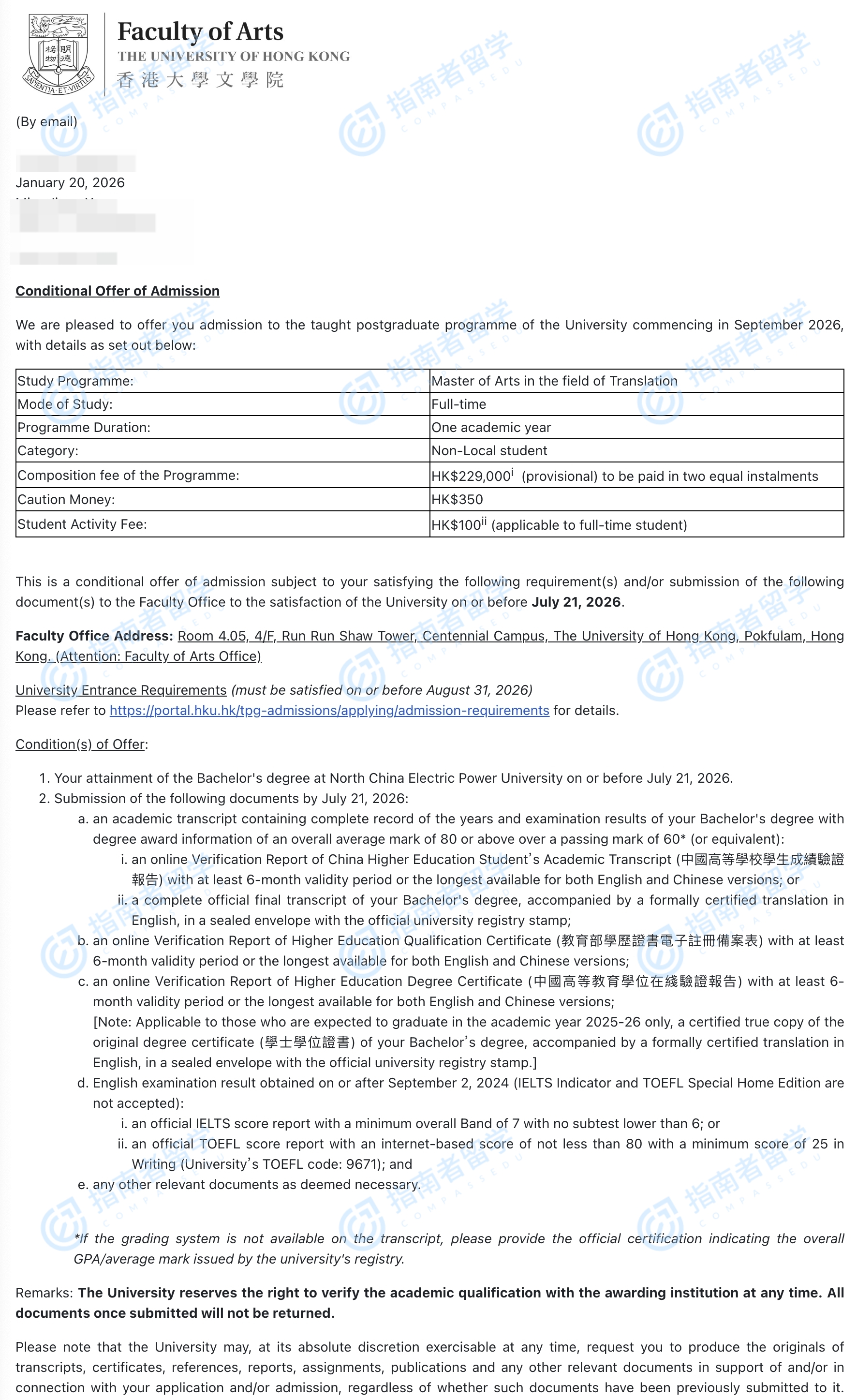 香港大學(xué)翻譯文學(xué)碩士研究生offer一枚