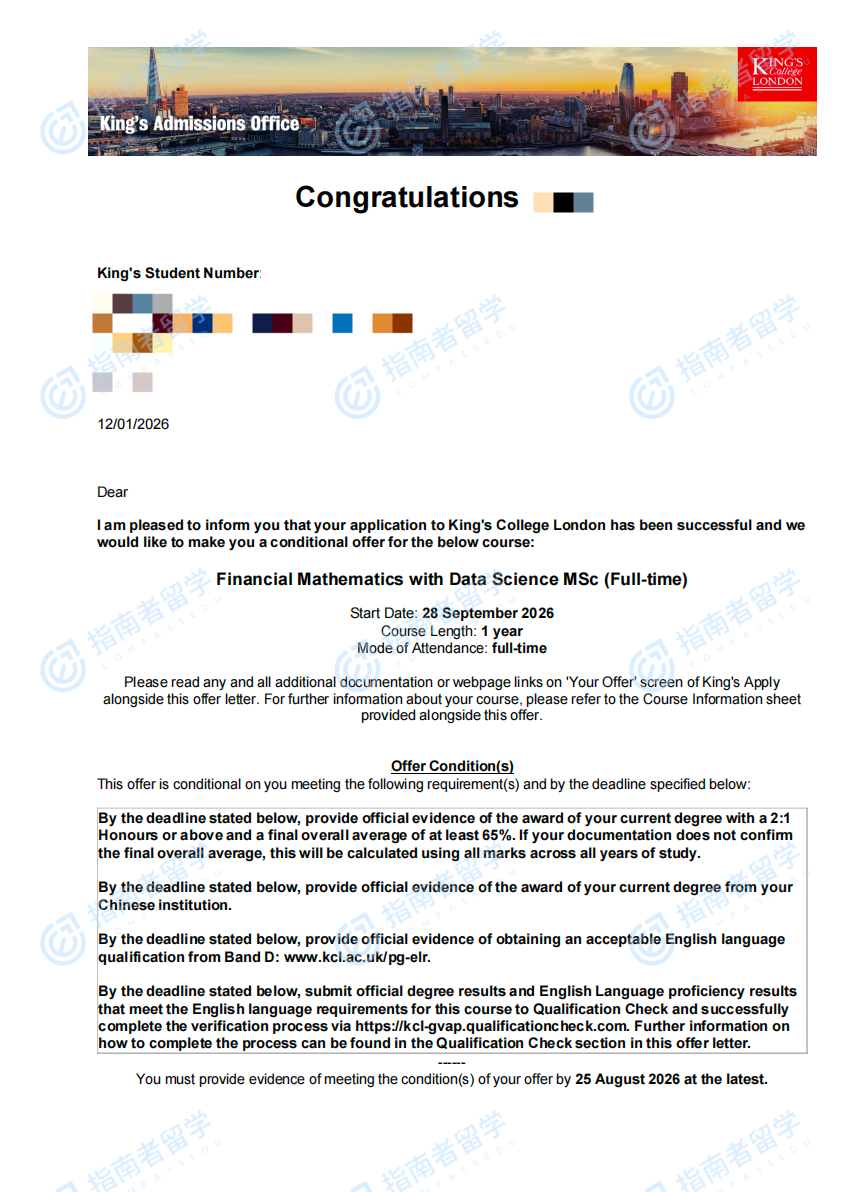 倫敦大學(xué)國王學(xué)院金融數(shù)學(xué)與數(shù)據(jù)科學(xué)理學(xué)碩士研究生offer一枚