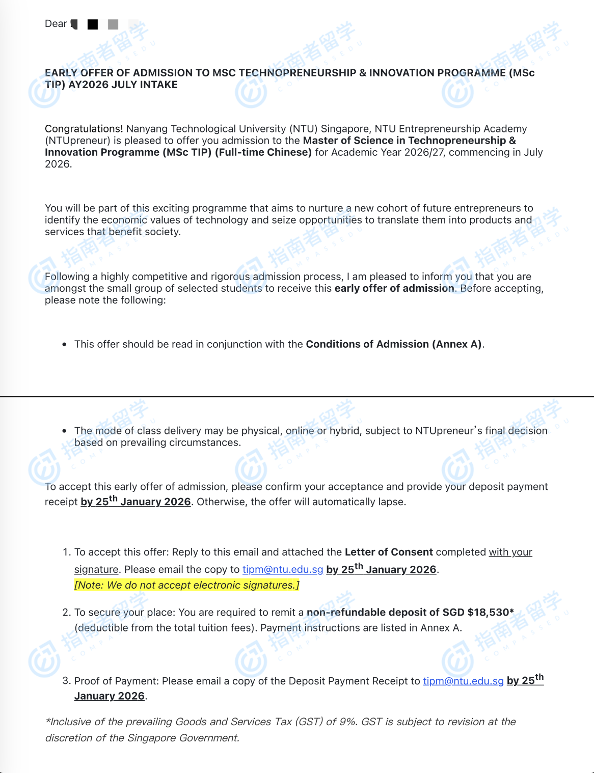 南洋理工大學(xué)科技創(chuàng)業(yè)與創(chuàng)新理學(xué)碩士(中文授課)研究生offer一枚
