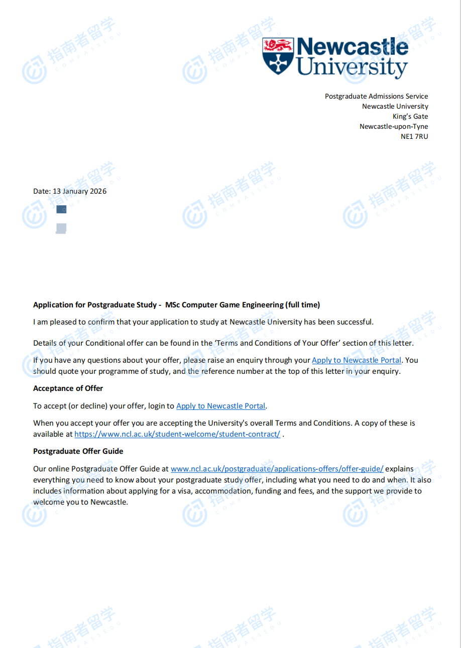 紐卡斯?fàn)柎髮W(xué)(英國)電腦游戲工程理學(xué)碩士研究生offer一枚