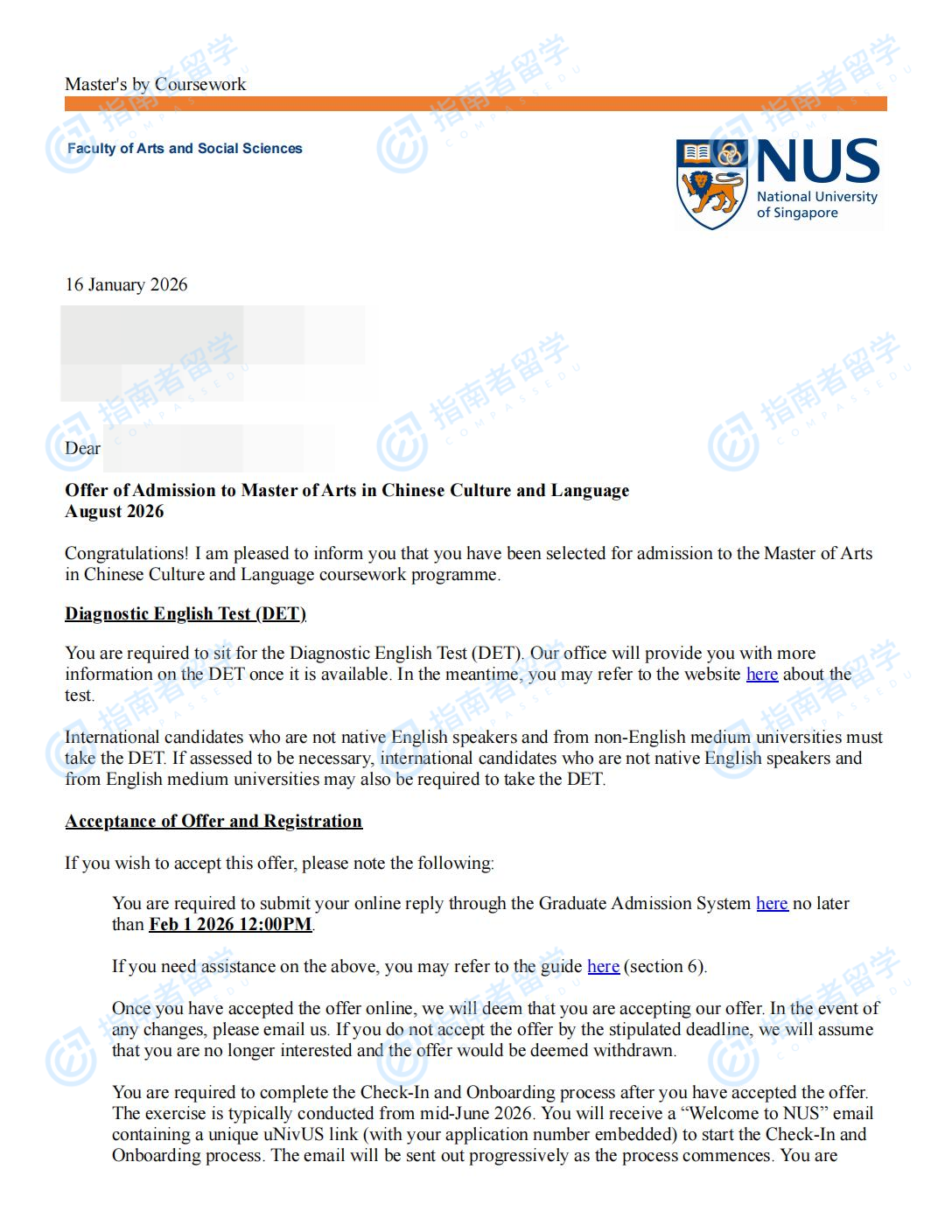 新加坡國(guó)立大學(xué)中國(guó)文化與語(yǔ)言文學(xué)碩士研究生offer一枚