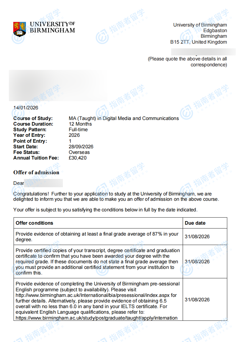 伯明翰大學數(shù)字媒體與傳播文學碩士研究生offer一枚