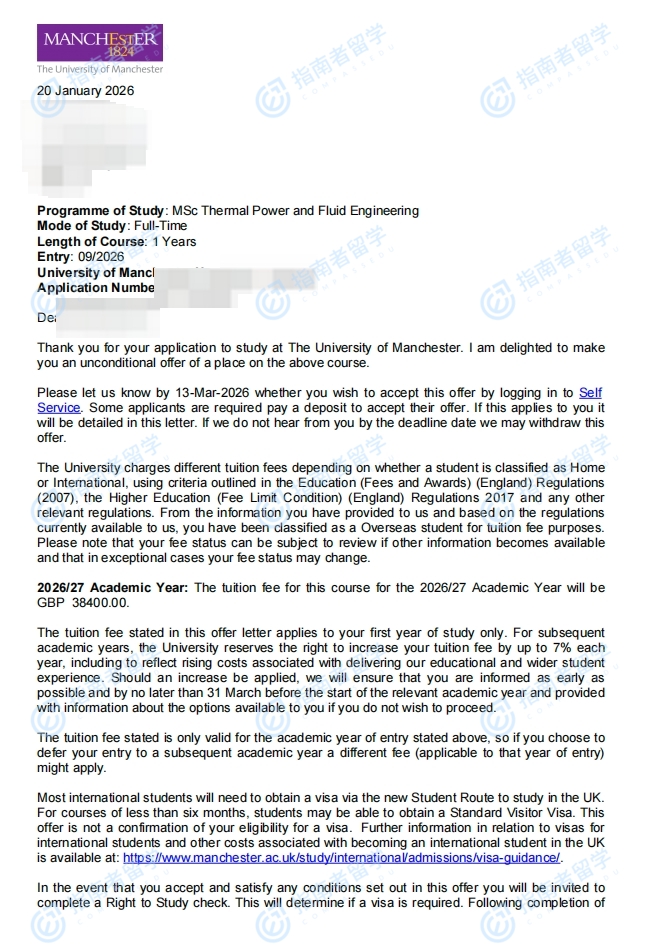 曼徹斯特大學熱能與流體工程理學碩士研究生offer一枚