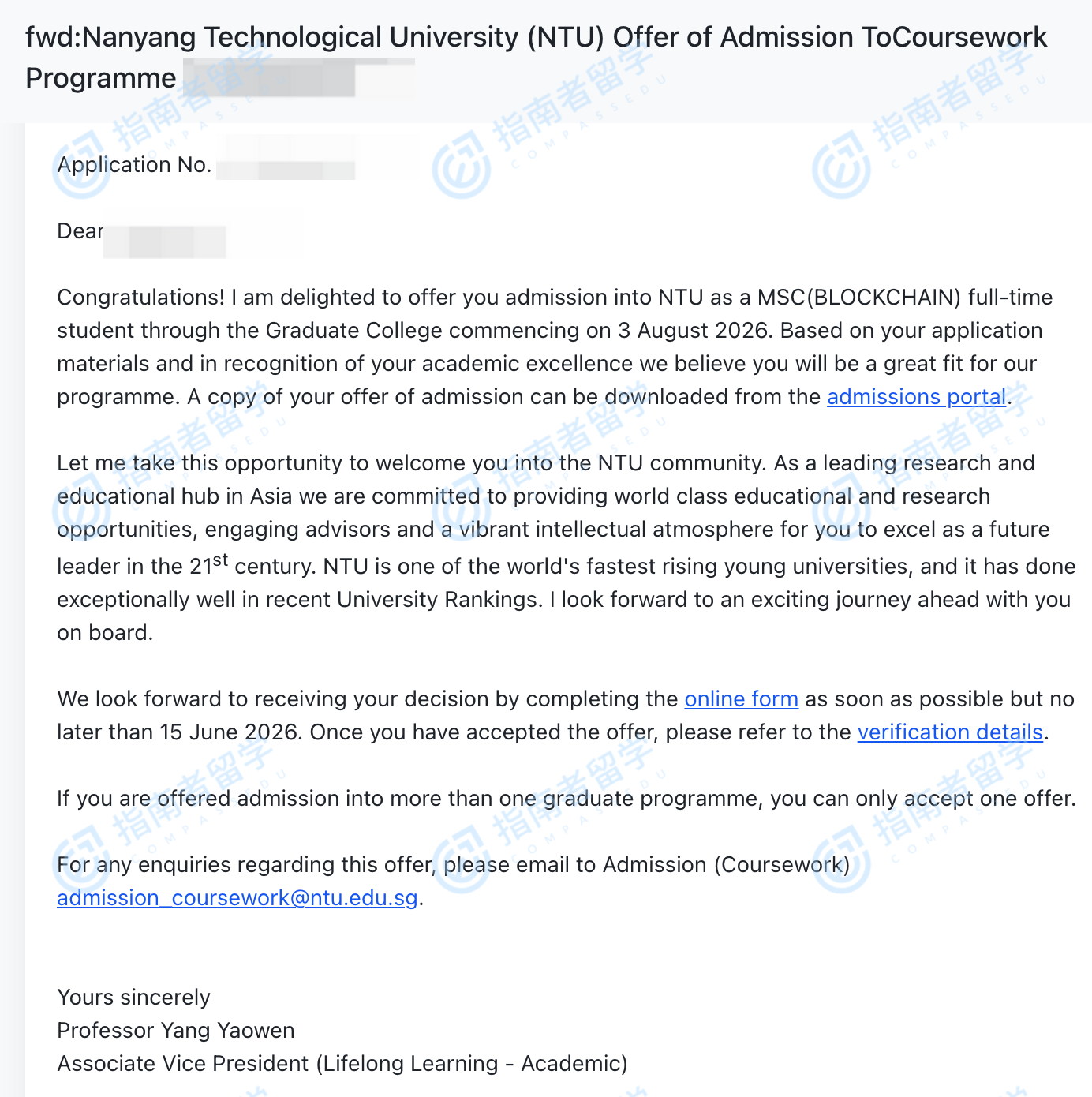南洋理工大學(xué)區(qū)塊鏈理學(xué)碩士研究生offer一枚