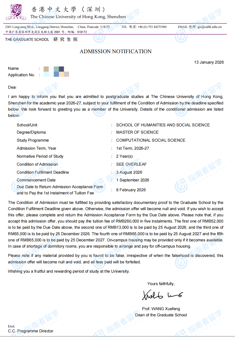 香港中文大學(xué)計(jì)算社會(huì)科學(xué)理學(xué)碩士(CUHK-Shenzhen)研究生offer一枚