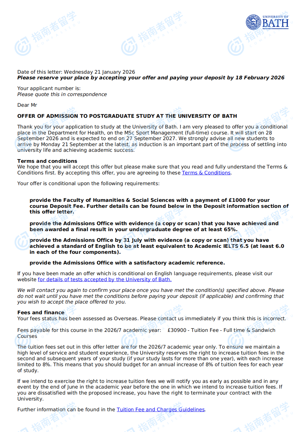 巴斯大學(xué)運(yùn)動(dòng)管理理學(xué)碩士研究生offer一枚