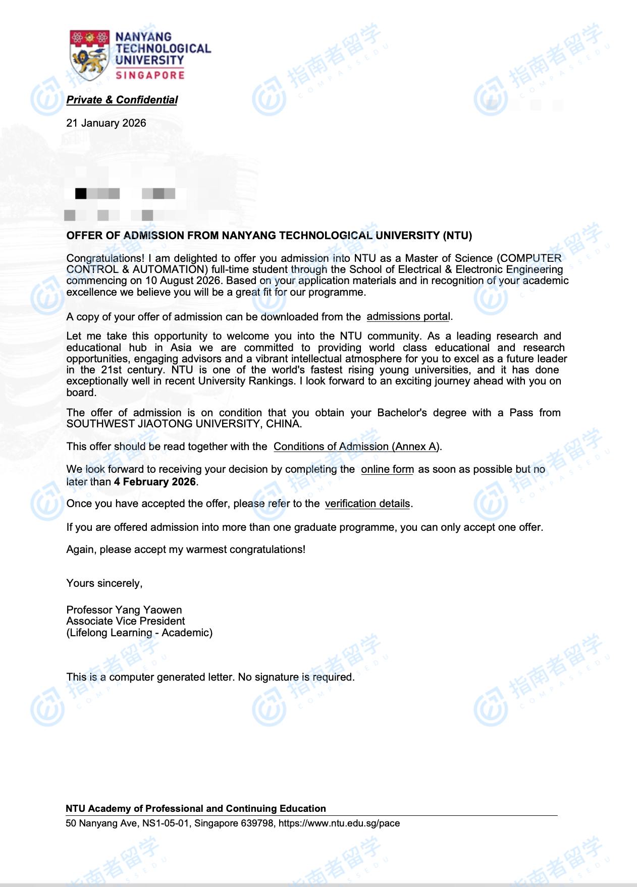 南洋理工大學(xué)計(jì)算機(jī)控制與自動化理學(xué)碩士研究生offer一枚